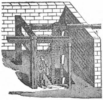 Early in the seventeenth century Sir George Bruce carried on a great business as a salt manufacturer, and James VI., who frequently visited Dunfermline and Culross, gave him a monopoly for the furnishing of certain towns in England with salt. Great as was the enterprise he showed in connection with the salt trade it was not a patch on the enterprise and the skill he exhibited in connection with coal getting. Between the thirteenth and the fifteenth centuries the methods adopted for coal getting were very simple if laborious. When the monks of Dunfermline Abbey began to get coals on the estate of Pittencrieff they simply quarried the edges of the crop seams. As time went on the upper seams were followed by mines run in from the surface, and the water was run off by levels, trenches connecting the mines with the nearest burns. The requirements of the salt trade caused a rapid development of the Scotch coalfields, and the demand for fuel became so great that in 1573 a coal scare arose, and Parliament was induced to pass an act prohibiting the export of coal. The prohibition was winked at by some coalmasters who profited by a monopoly. In 1579 and 1507 the coal working on many estates had become practically impossible on the old "coal heugh" system, and the cries of a "maist exorbitant dearth and scantiness of fewall" became so loud that Parliament was again compelled to intervene, and in the reign of Mary Queen of Scots an Act was passed prohibiting the exportation of coal under very severe penalties. The monks of Culross imitated the monks of Dunfermline Abbey, and opened up coal works, and by the close of the sixteenth century coal digging had practically ceased in Culross district because it was found impossible to drain the workings by trenches and levels. In 1612, when it seemed as if the days of the entire coalfields of Scotland were numbered, Sir George hit upon the idea of draining coal mines by the Egyptian wheel system. He had read of the Egyptians raising water from deep wells by chains of buckets, and he resolved to try the experiment at Culross. On the shore, on what is now Dunimarle orchard, he had a shaft sunk to the upper seams of coal, and he fitted an Egyptian -wheel and chain of buckets on the pit. The drawing given below, for which the writer is indebted to Mr Robert L. Galloway, mining engineer, gives a fair idea of the machine. The wheel was driven by three horses, and consisted of an endless chain of 36 buckets. As eighteen full buckets ascended eighteen empty buckets descended. The experiment was a complete success.