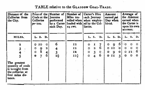 The short period of the last twenty-two years has produced a great advance upon the price of coals shipped on the river Forth; for, from the year 1785 to the year 1800, they rose from 4s. 10d. to 7s. per ton. At this instant they are from 9s. to 11s. per ton, (great coal always being understood); but during this latter period, the price of labour has again been doubled, and the price of wood, iron and ropes, much advanced.